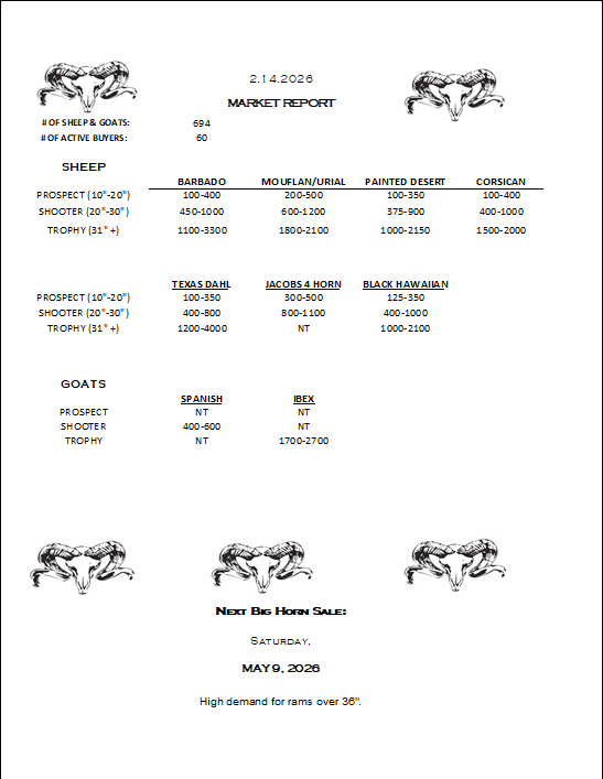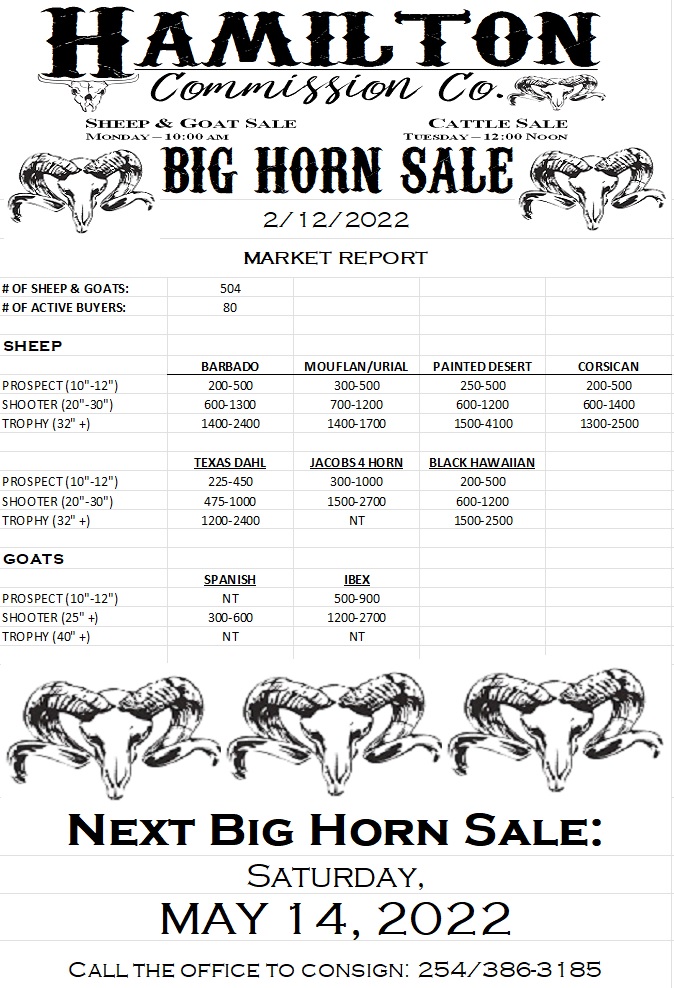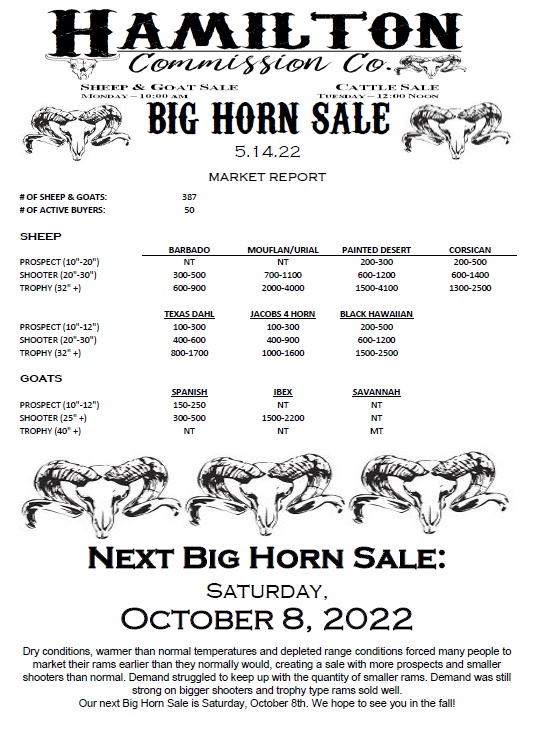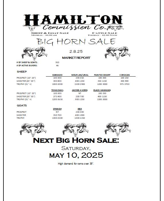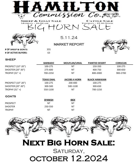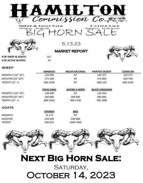 ![May be an image of text that says 'HAMILTON CΏ. Commission ያዊ. SHEEP & GOAT SALE CATTLESALE CATTLES 10:00AM TUESDA NOON BIG HORN SALE 2.11.23 MARKET REPORT #O OF SHEEP GOATS: ACTIVE BUYERS: 596 74 SHEEP BARBADO (20"-30" -30") TROPHY TROPHY(32"+) MOUFLAN/URIAL 275-700 BDD-1100 PAINTED DESERT 100-450 100-450 350-1100 1300-2000 CORSICAN 800-2450 PROSPECT '-12"1 SHOOTER(20*30") 30") TEXAS DAHL 300-800 900-1500 JACOBS4HORN 300-850 1000-3300 GOATS BLACKHAWAIIAN 250-1250 350-350 75D-1550 SPANISH PROSPECT (10"-12"] R(25" TROPHY TROPHY(40*+) (40" 125-180 250-350 NT NT NEXT BIG HORN SALE: SATURDAY, MAY 2023'](https://scontent-dfw5-1.xx.fbcdn.net/v/t39.30808-6/330221069_917422869390460_8350070374226735173_n.jpg?stp=cp6_dst-jpg&_nc_cat=101&ccb=1-7&_nc_sid=8bfeb9&_nc_ohc=_PWZrJipNmgAX8EdOuv&_nc_ht=scontent-dfw5-1.xx&oh=00_AfDNe9l4TALImVlLe3FdrBV8O3z1_CzZvhxkFNhwrz0B3A&oe=63F2F5E4)