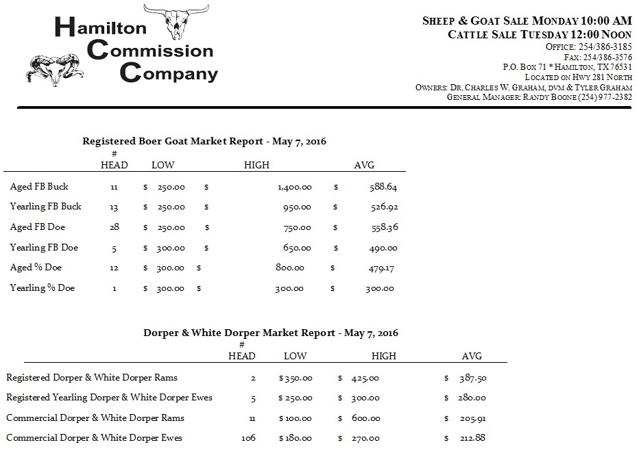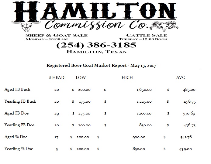 May 9, 2015 Registered Boer Goat Sale Market Report